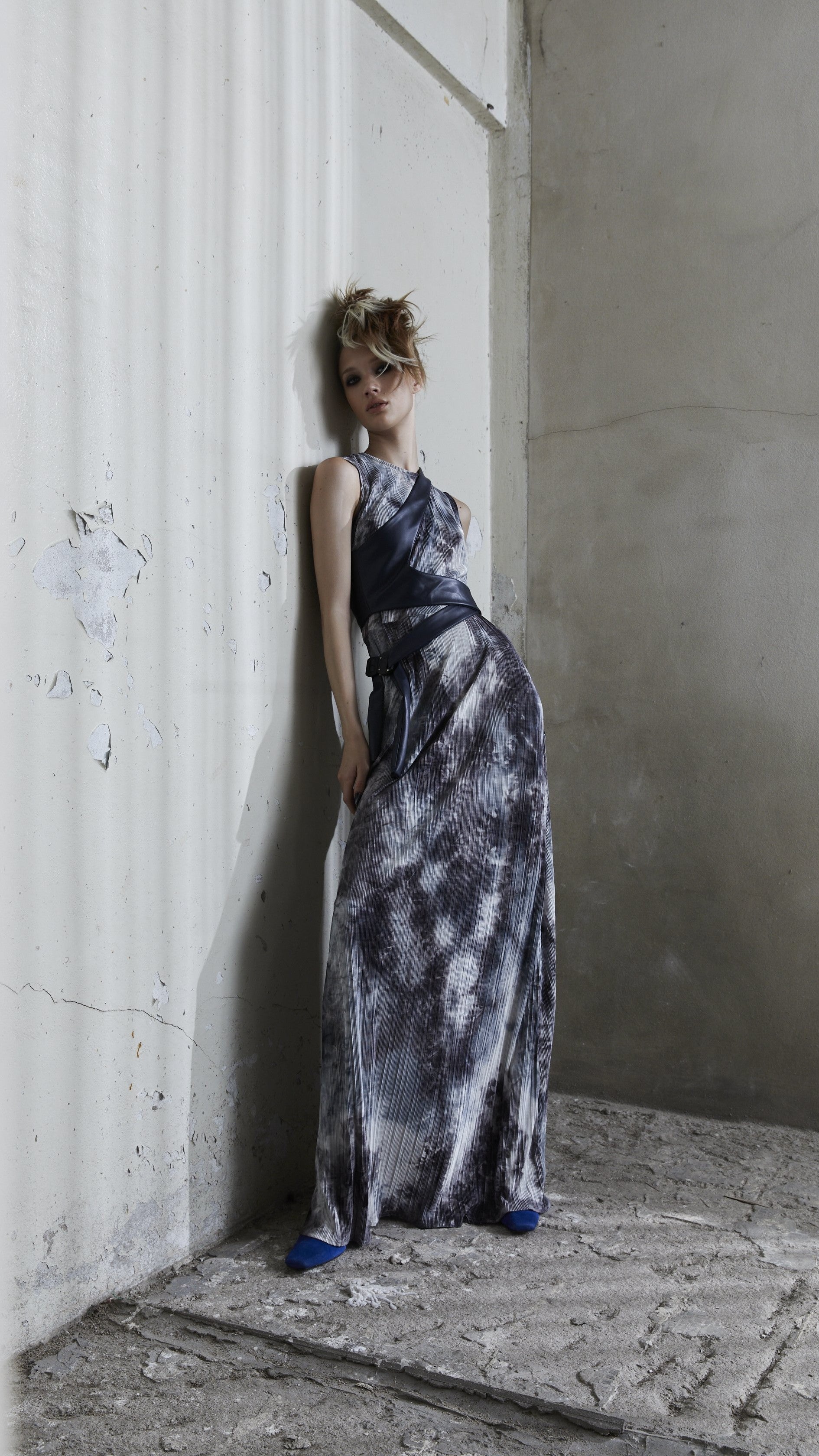 Pleated Maxi dress in either Green and Blue or Grey and Blue. Includes matching vegan leather harness.