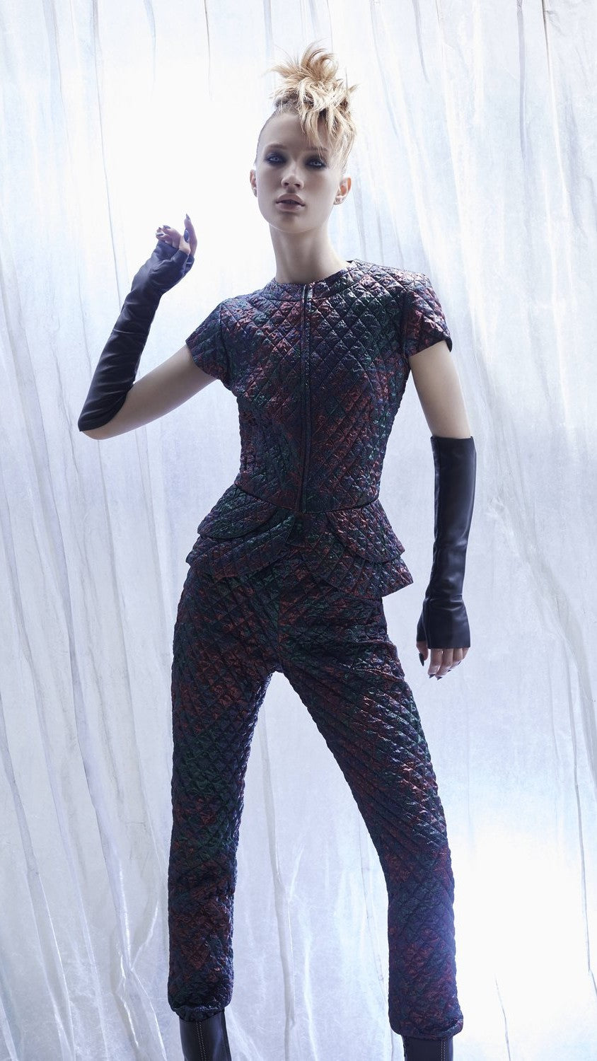 Jacket and Trouser Set in either Silver Sequin or Metallic Quilted Brocade.
