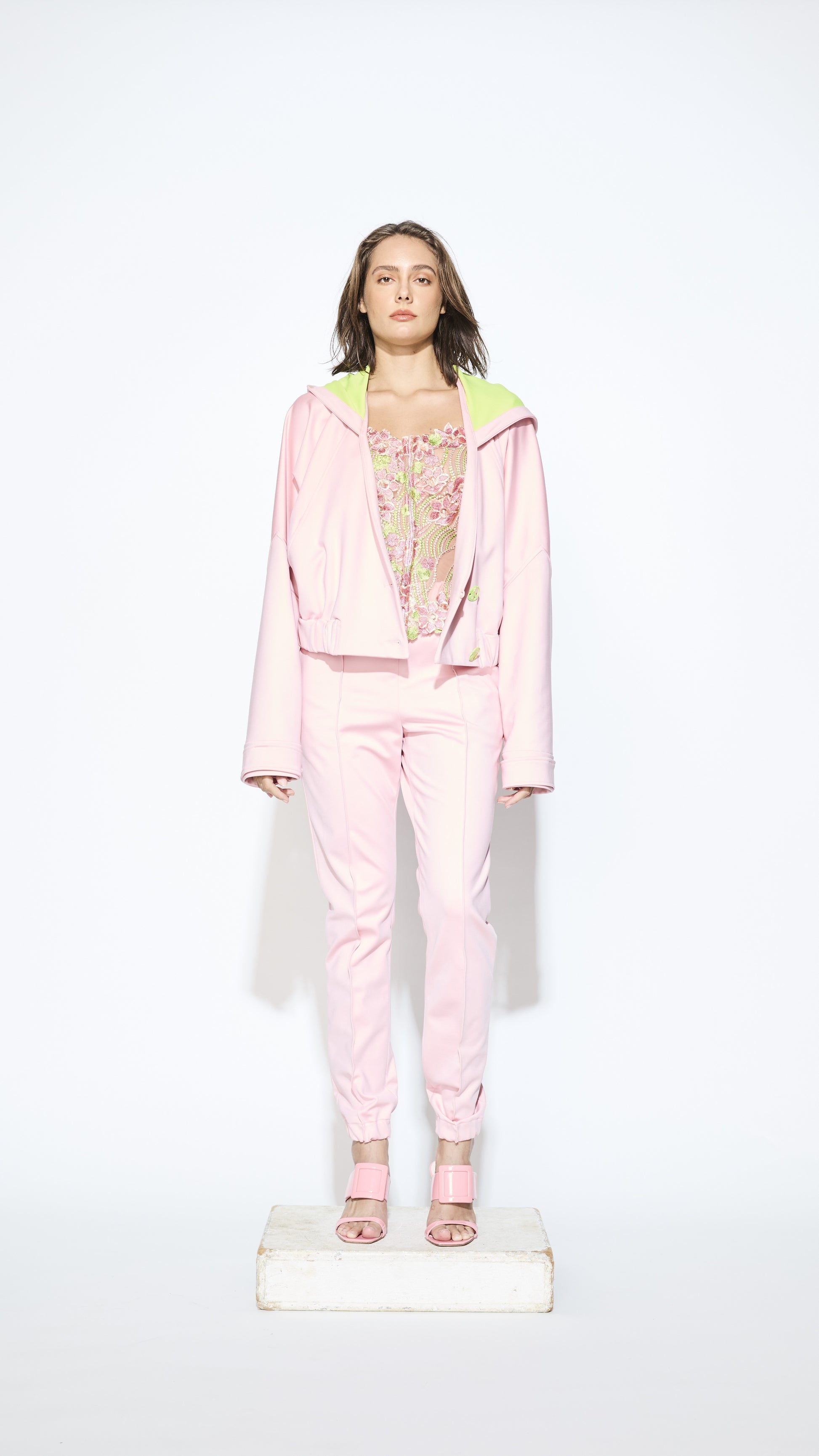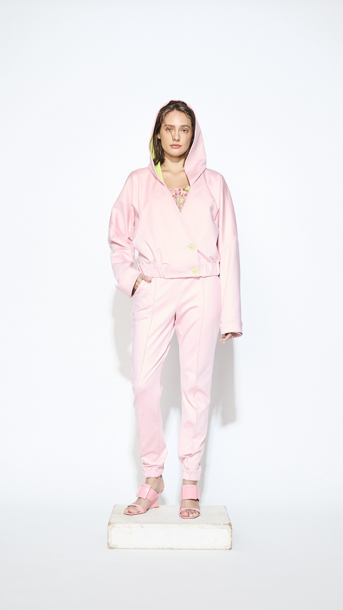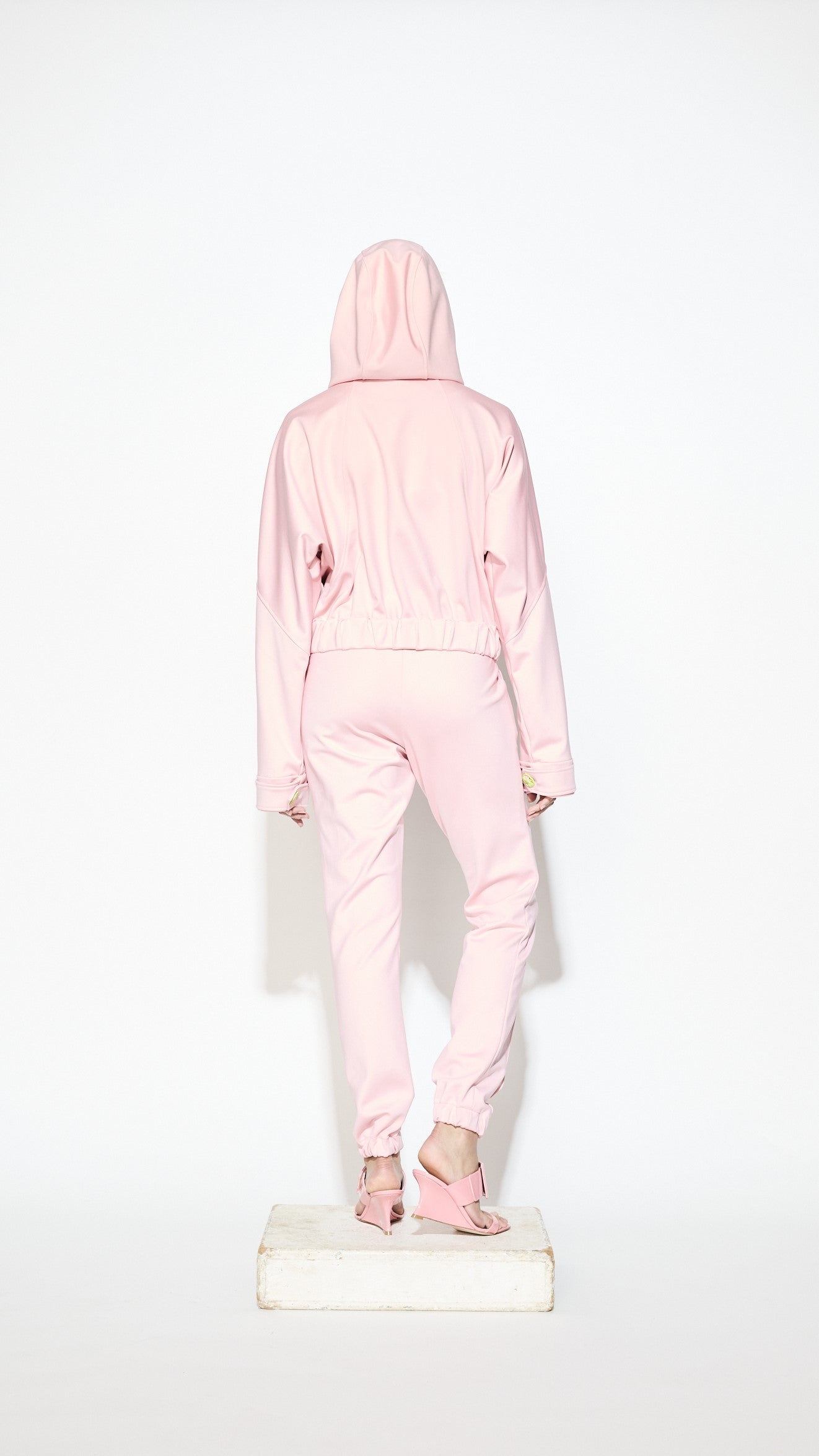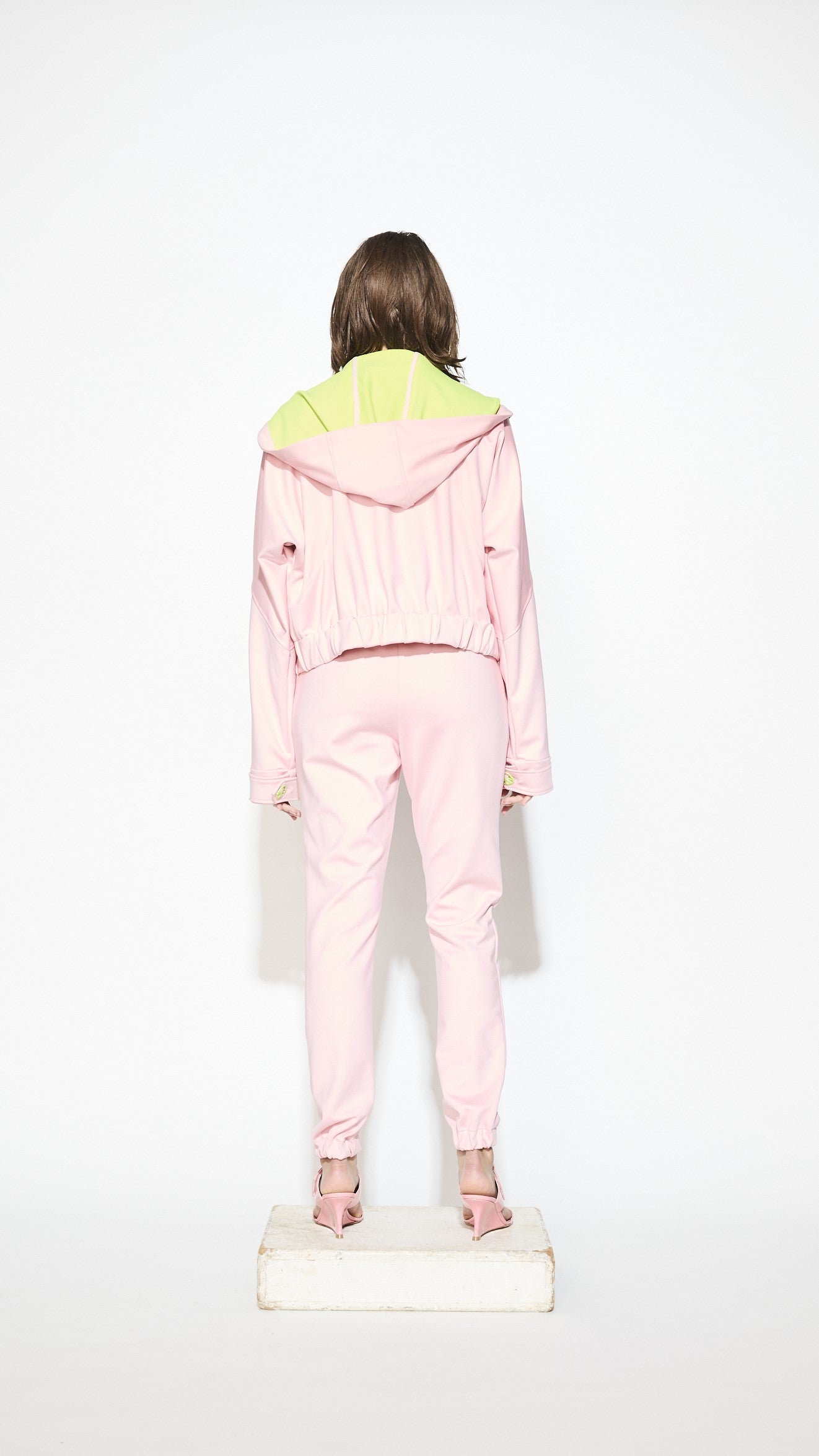 Dual tone neoprene track pants and hooded jacket.