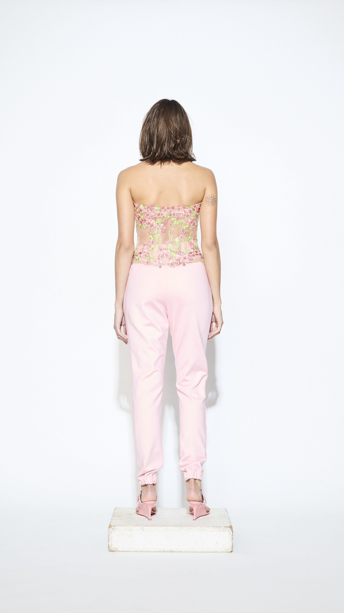 Hand embellished lace corset with front zip.