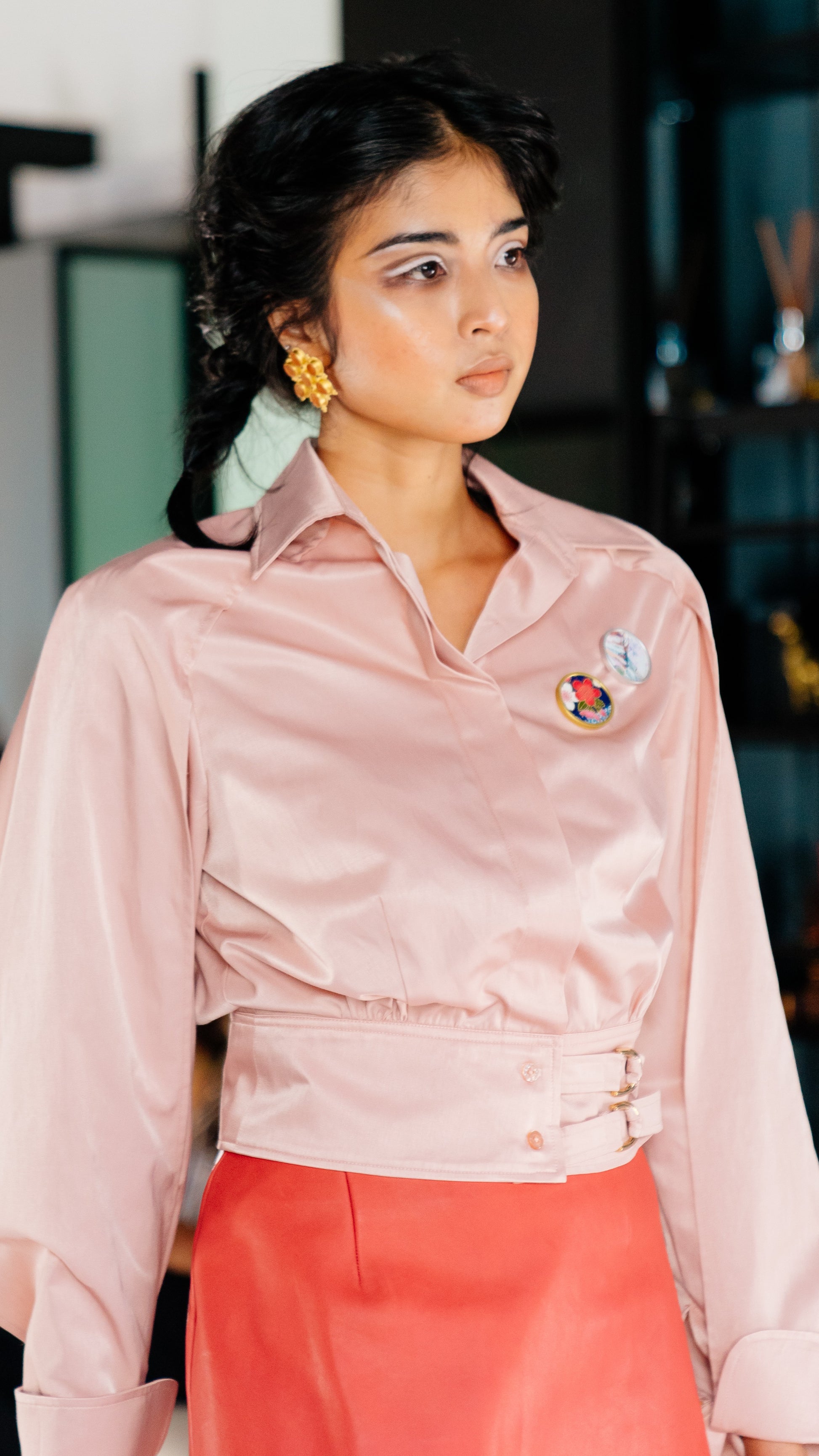 100% cotton cropped priest shirt with front opening. 100% leather skirt.