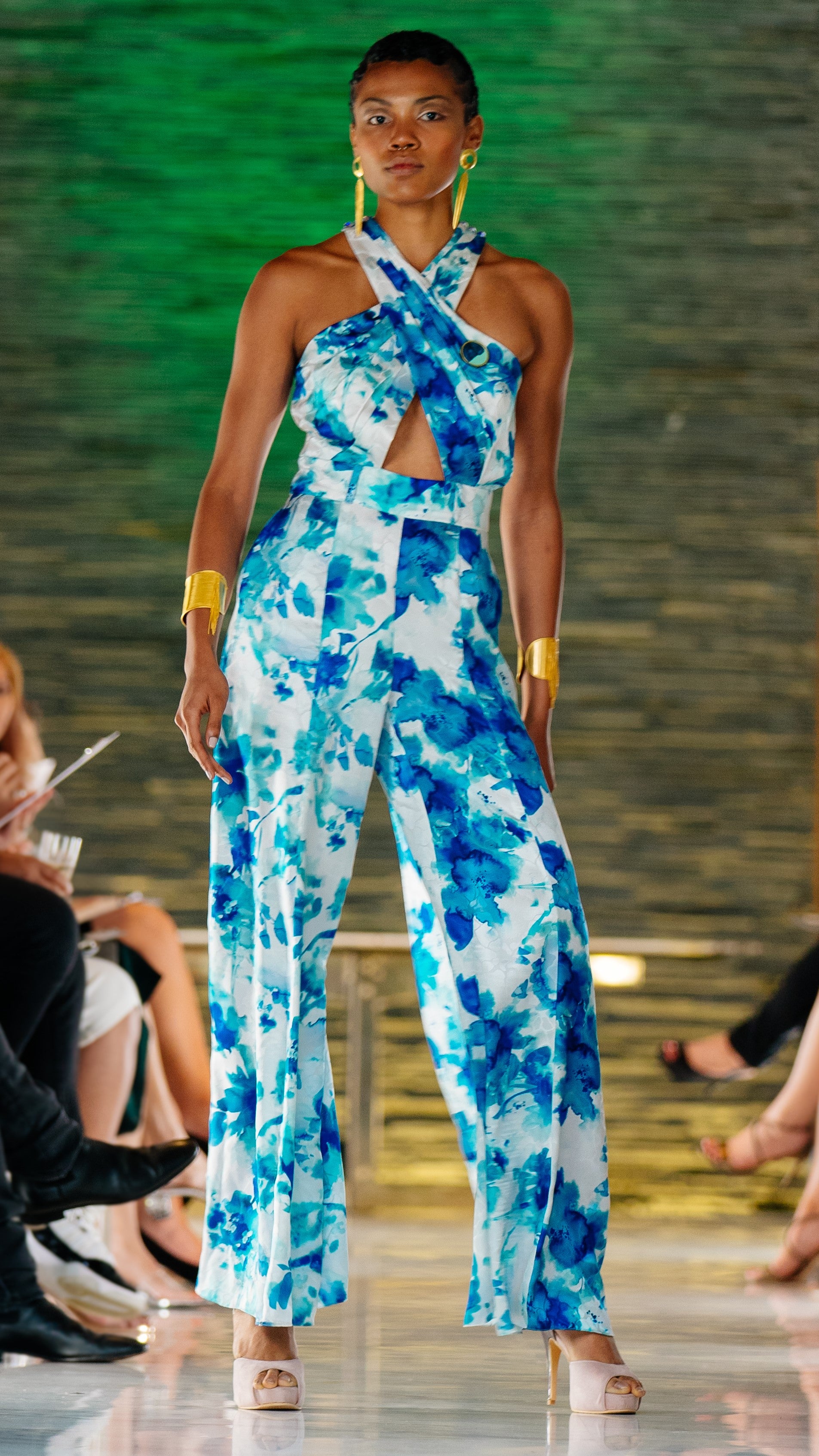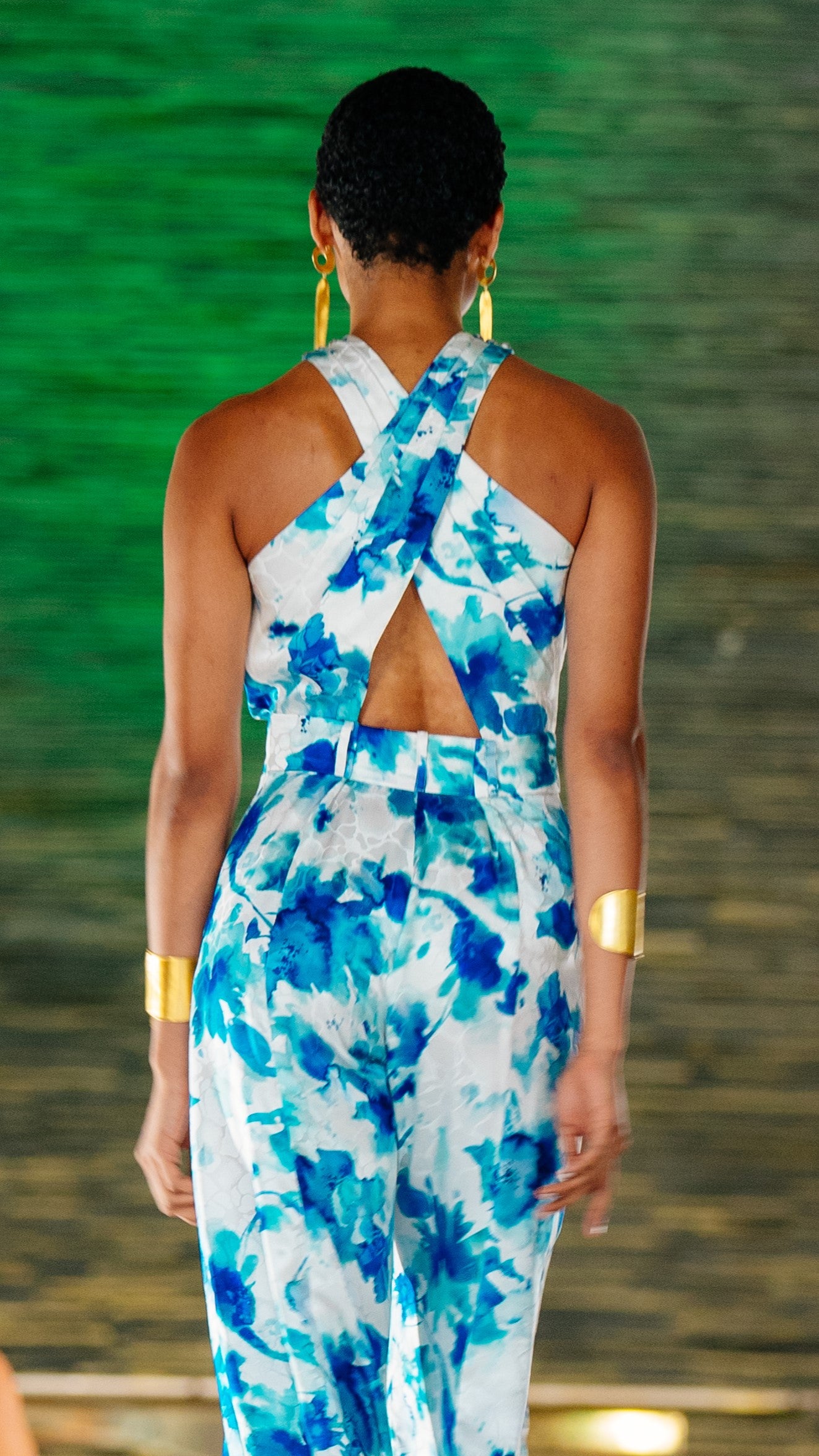 Blue and white printed jacquard jumpsuit with back and front crossover and crystal buttons.