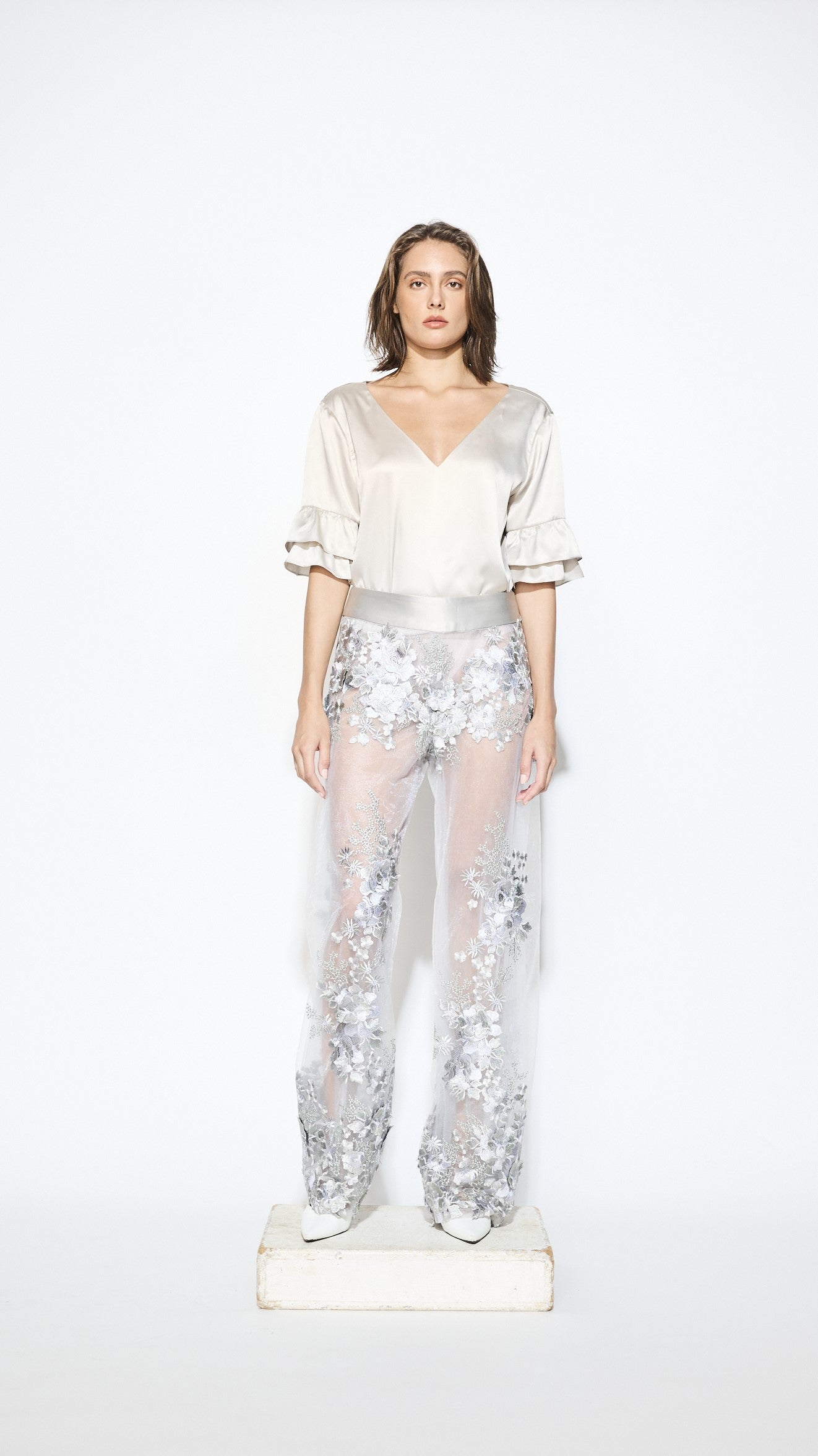 Silk blouse with back tie and flounced sleeves. Hand crafted sheer lace trousers.