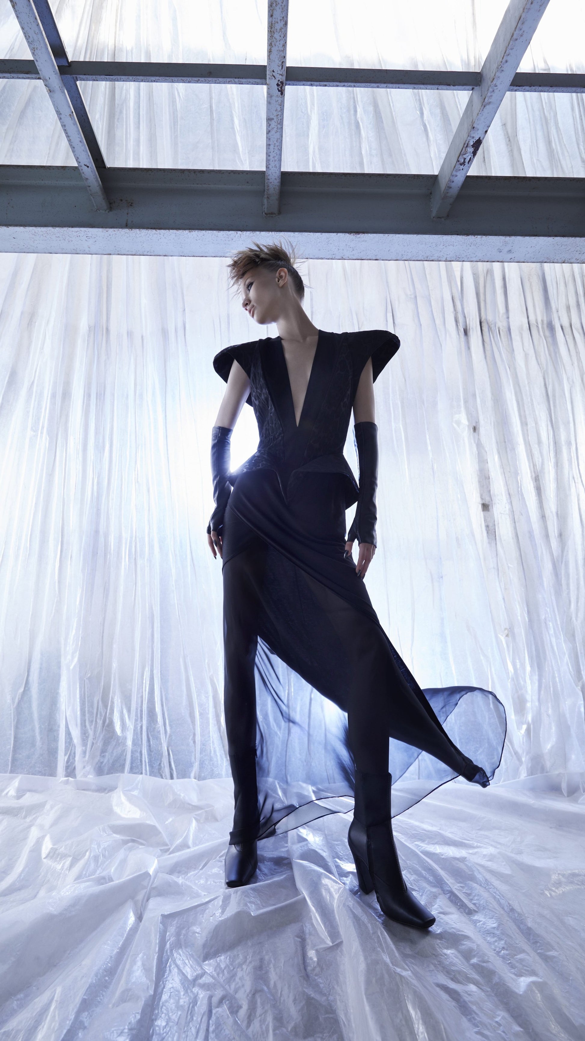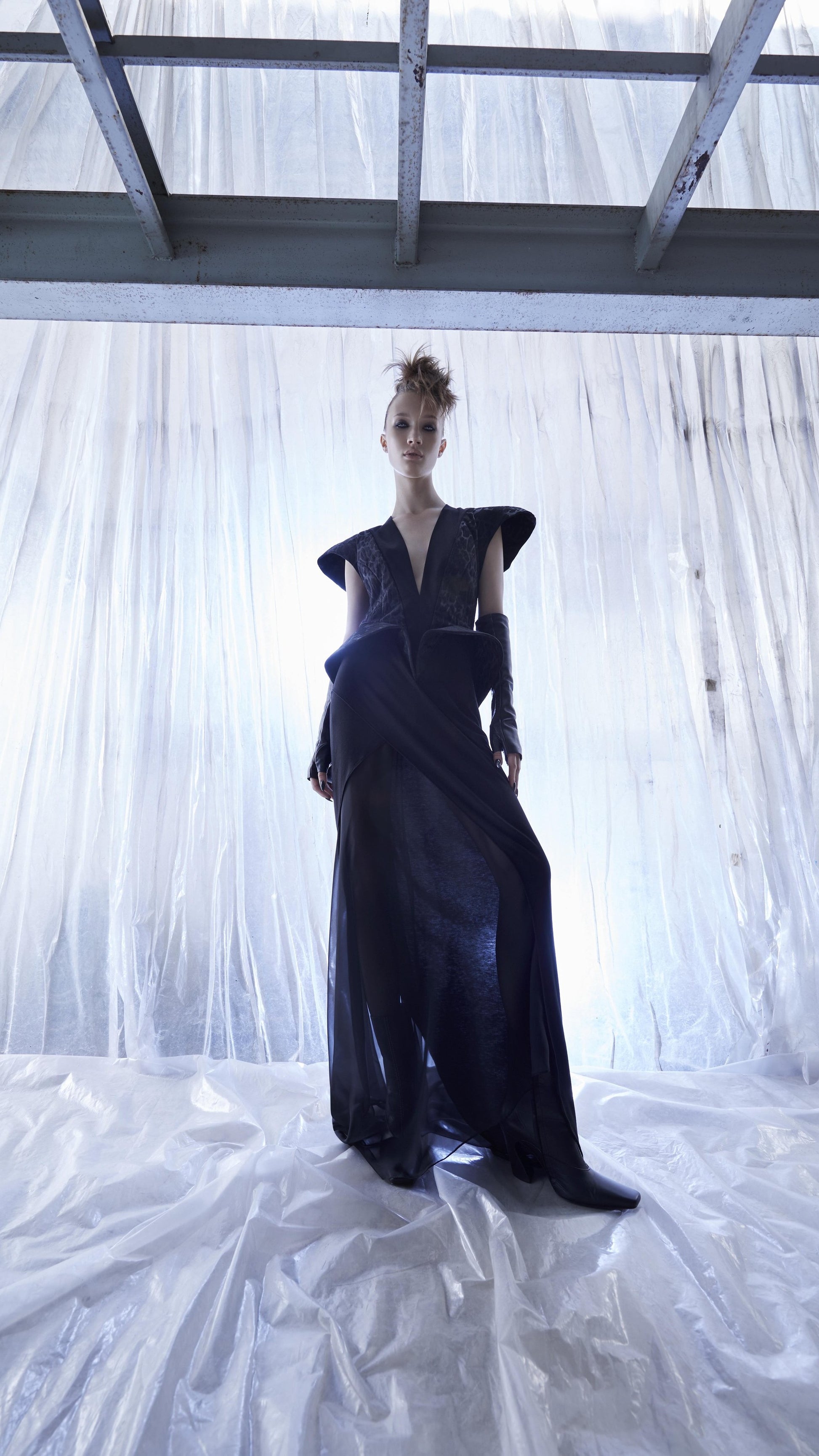 Black Animal Print Jacquard Dress with Deep V Tercel Neckline and Chiffon Skirt or Silver Marble Top with Separate Silver Chiffon Skirt
