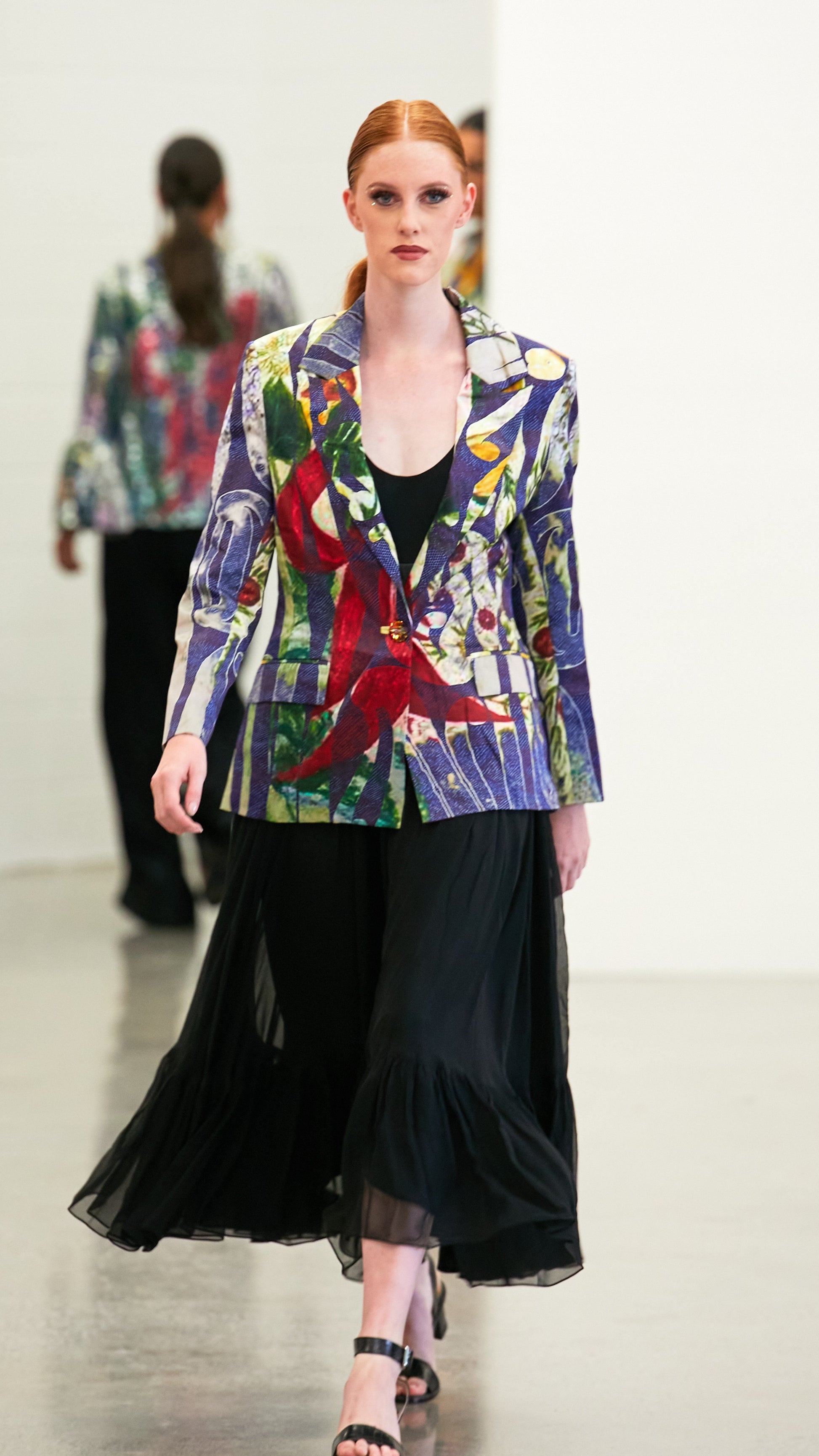 Our Hōtoke Blazer featured with our Kotahitanga print in the 100% Silk Satin. Made to Measure.