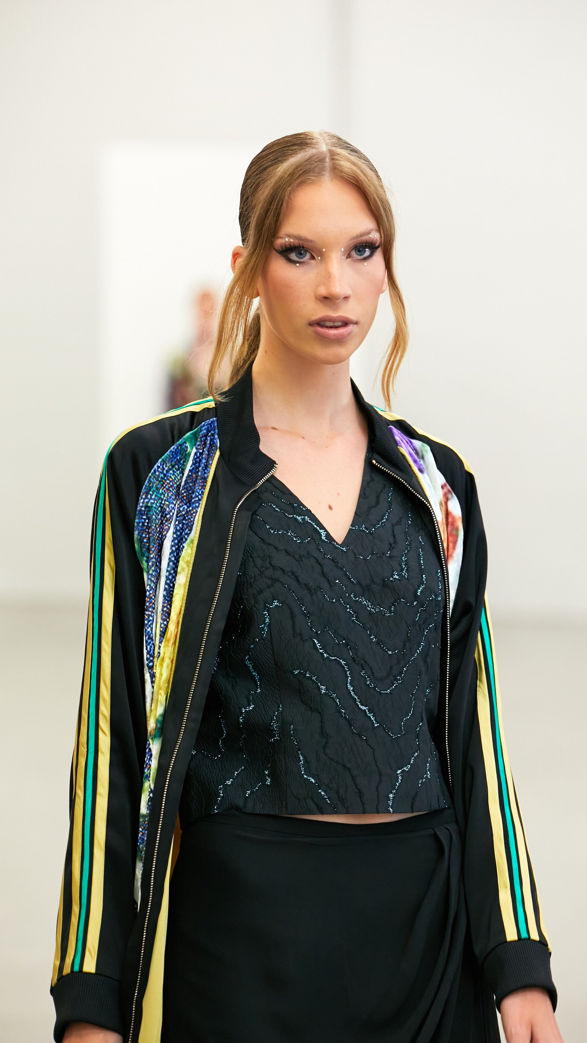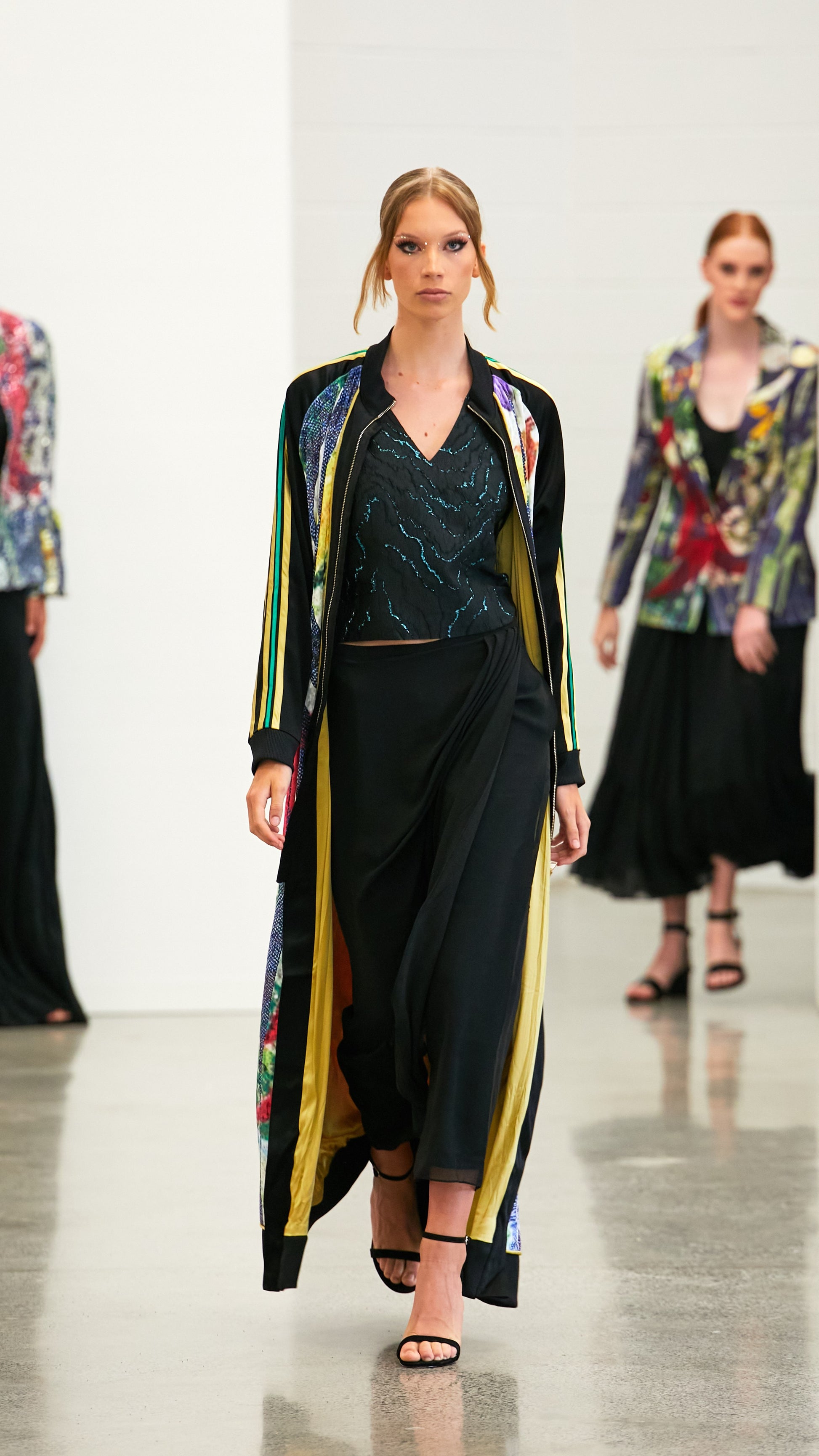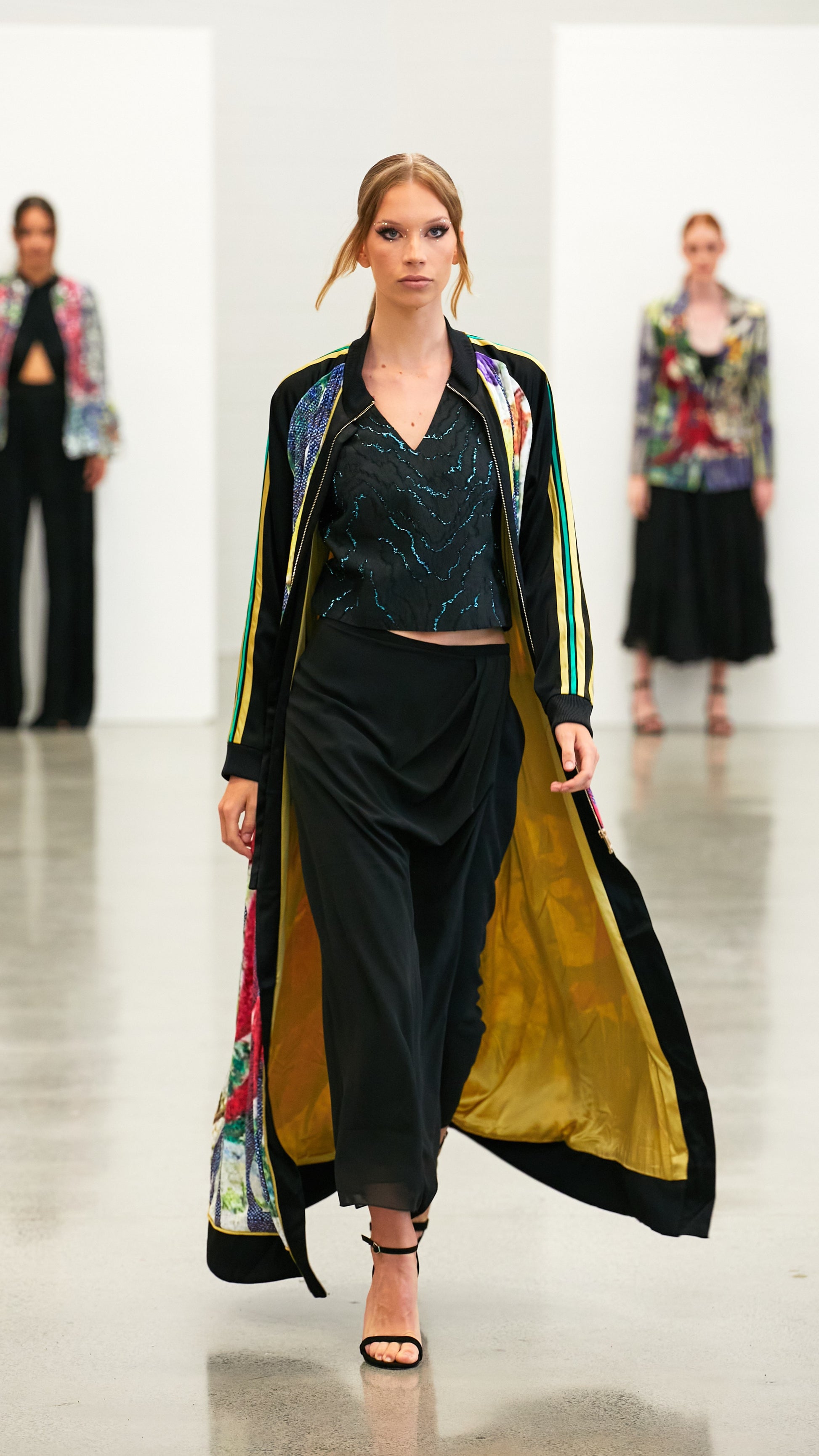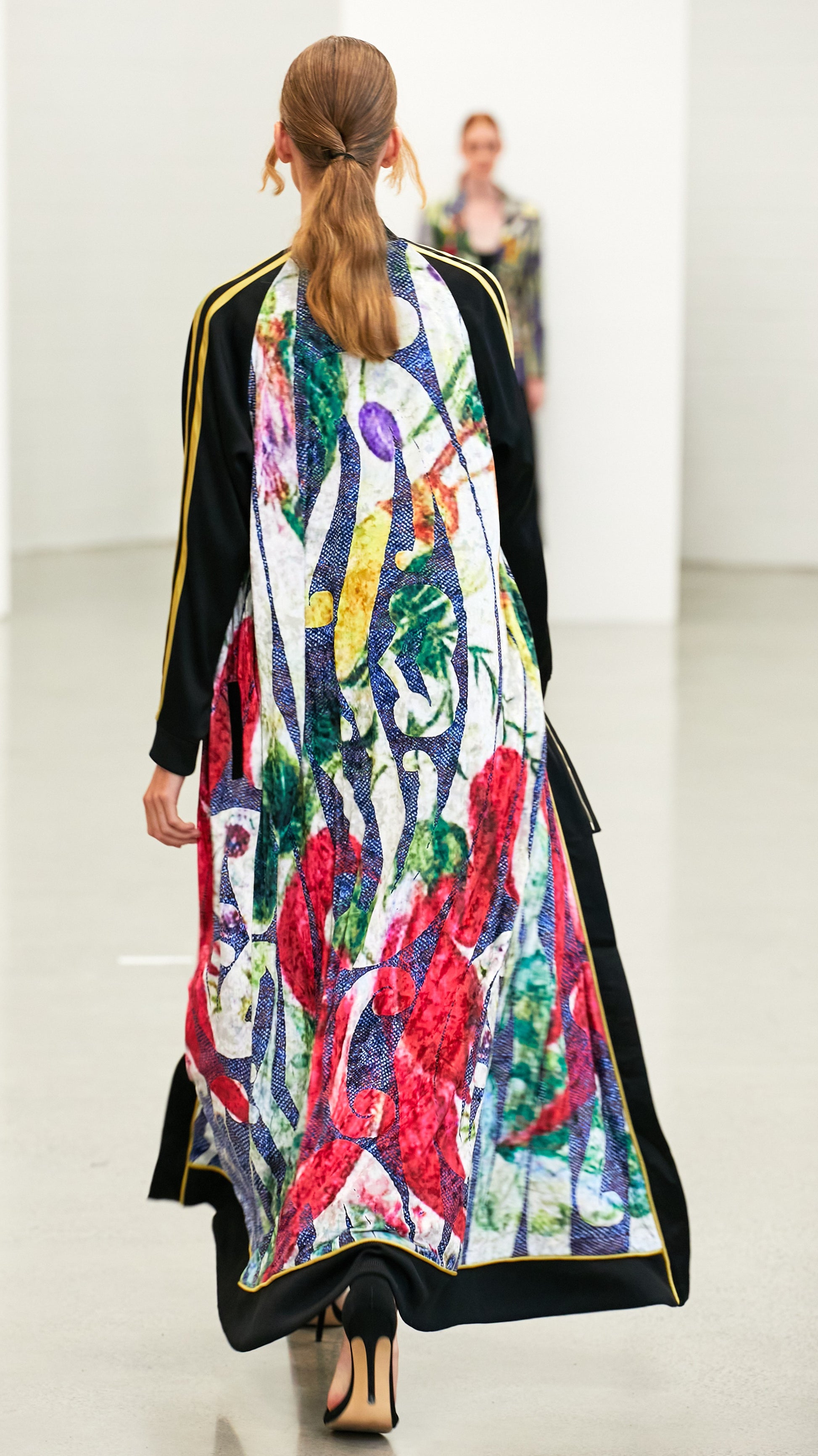Elongated bomber jacket in our Kotahitanga velvet print.
