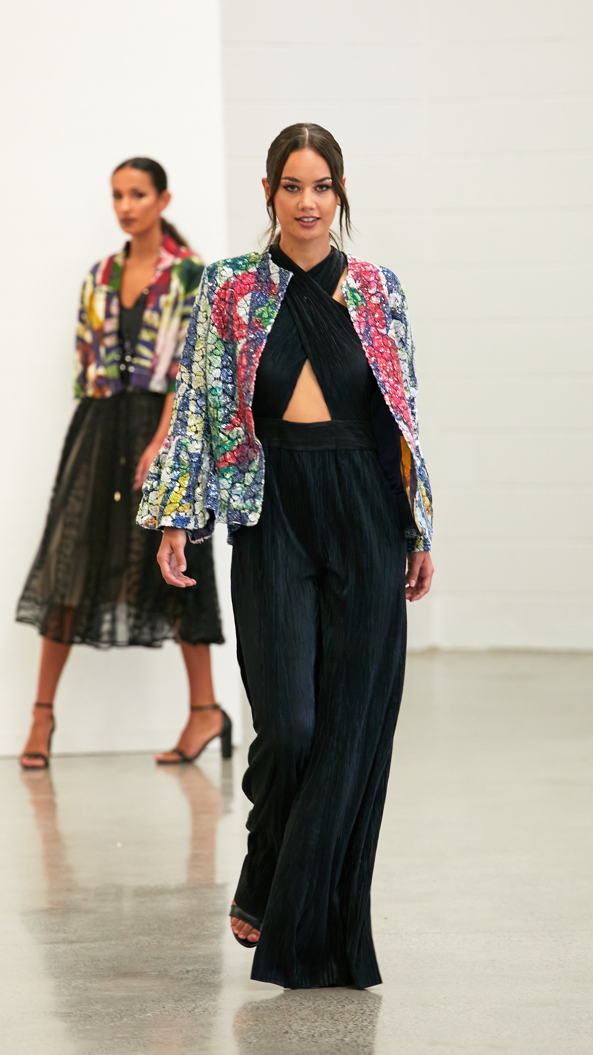 Flared sleeve crop jacket in Kotahitanga sequin lace print.