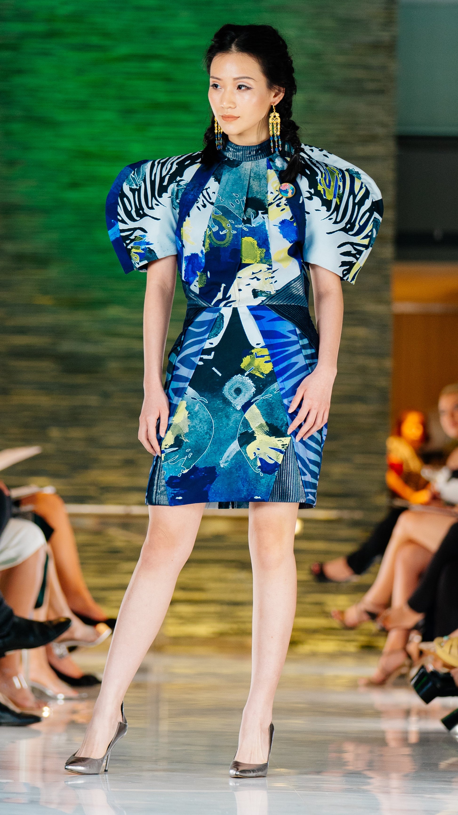 Custom printed fabric with slight stretch dress. Oversized shoulders.